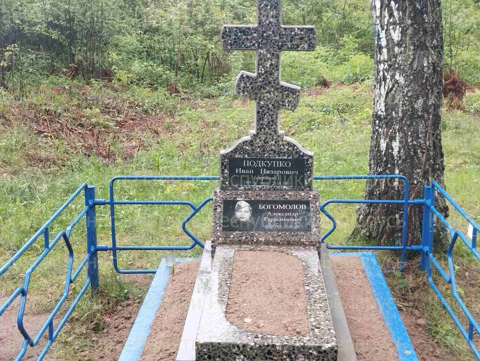 Памятник изготовлен из железа, на нём доска с надписью и фотографией Богомолова А.Г. и надписью Подкупко И.Н.