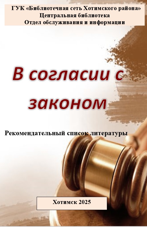 В согласии с законом : рекомендательный список литературы Республики Беларусь / ГУК «Библиотечная сеть Хотимского района» ; Центральная библиотека ; Отдел обслуживания и информации [составитель Е. А. Шумейко, ответственный за выпуск О. И. Тищенко]. — Хотимск, 2025. — 11 с.